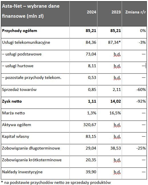 Na koniec roku aktywa Asta-Net wynosiły 320,67 mln zł, a kapitał własny – 83,15 mln zł. Zobowiązania długoterminowe sięgnęły 29,04 mln zł, a krótkoterminowe – 20,35 mln zł.
