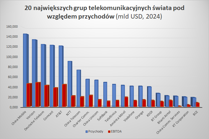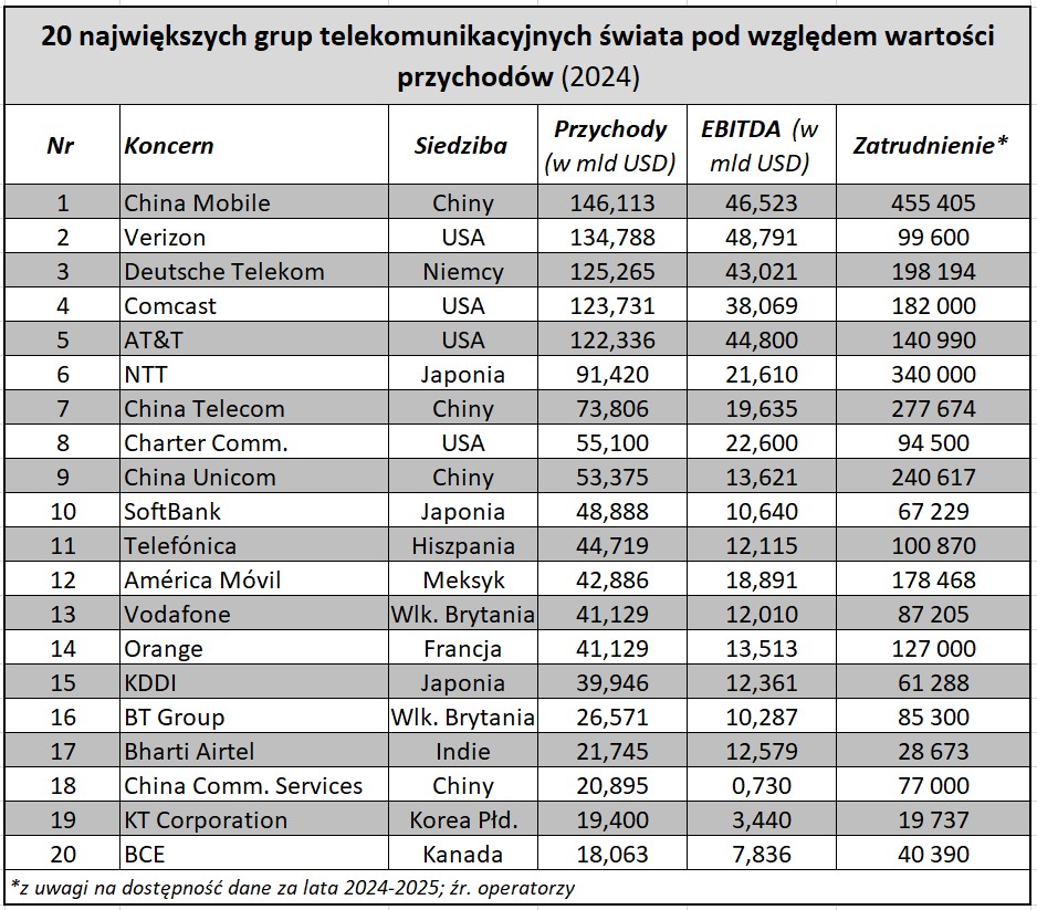 Listę 20 najbardziej dochodowych grup telekomunikacyjnych na świecie tworzyliśmy, posługując się najpierw już dostępnymi listami, które weryfikowaliśmy ‒ firma po firmie ‒ na podstawie publikowanych przez nie sprawozdań za ostatni rok obrotowy ‒ najczęściej za 2024, czasem za okres kwiecień 2024 – marzec 2025. Wartości przychodów przeliczaliśmy na dolary wedle średniego kursu w danym roku obrotowym.