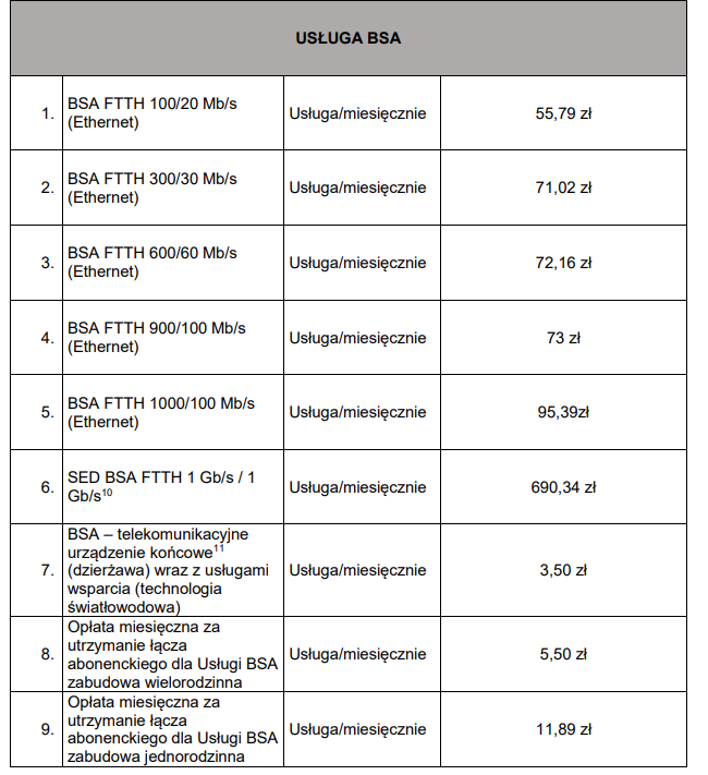 W przypadku usługi BSA operator ma w swej ofercie 6 przepływności, w tym jedną 1Gb/1Gb/s dla punktów SED (punkt adresowy z użytkownikiem lub użytkownikami końcowymi wymagającymi usługi detalicznej o najwyższych parametrach).