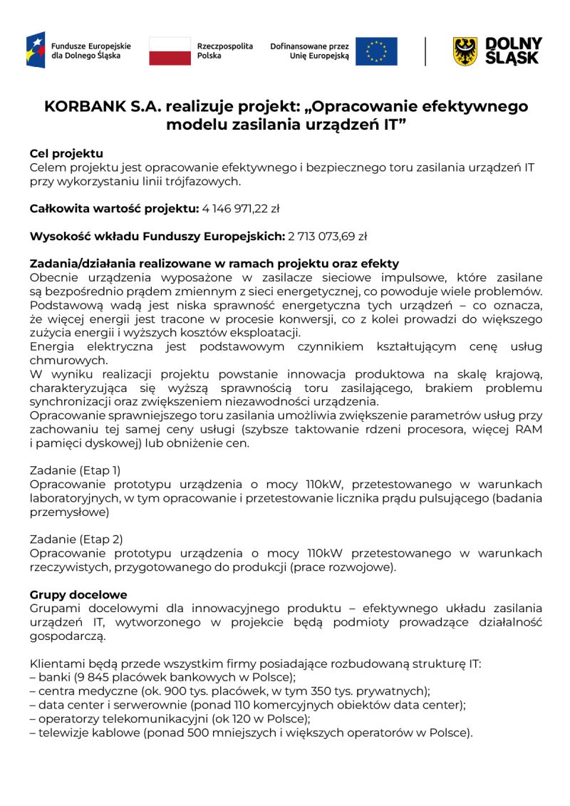 Korbank, wrocławski ISP, poinformował, że otrzymał unijne wsparcie na projekt: „Opracowanie efektywnego modelu zasilania urządzeń IT” o wartości ponad 4,1 mln zł, z czego dofinasowanie to ok. 2,7 mln zł.