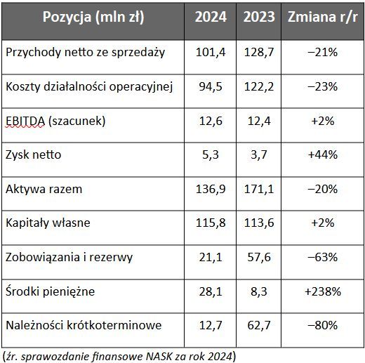 NASK S.A., spółka telekomunikacyjna należąca do NASK PIB, zakończyła 2024 r. z zyskiem netto na poziomie 5,3 mln zł wobec 3,7 mln zł rok wcześniej. Wynik poprawił się mimo wyraźnego spadku przychodów i ograniczenia skali działalności handlowej. Wciąż dominuje sprzedaż do właściciela.
