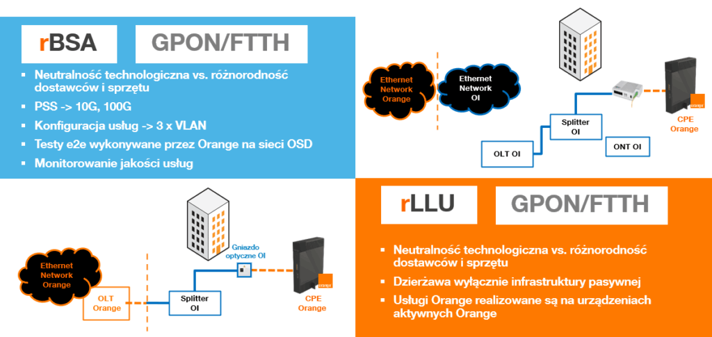 - rBSA (Remote Broadband Service Access): usługi realizuje na sieci i urządzeniach aktywnych Operatorów Infrastrukturalnych (OI), Oznacza to, że Orange dzierżawi gotową usługę transmisji danych, korzystając z urządzeń aktywnych (np. OLT) należących do OI. Model ten zapewnia mniejszą kontrolę techniczną nad siecią, ale upraszcza i przyspiesza proces uruchamiania usług.