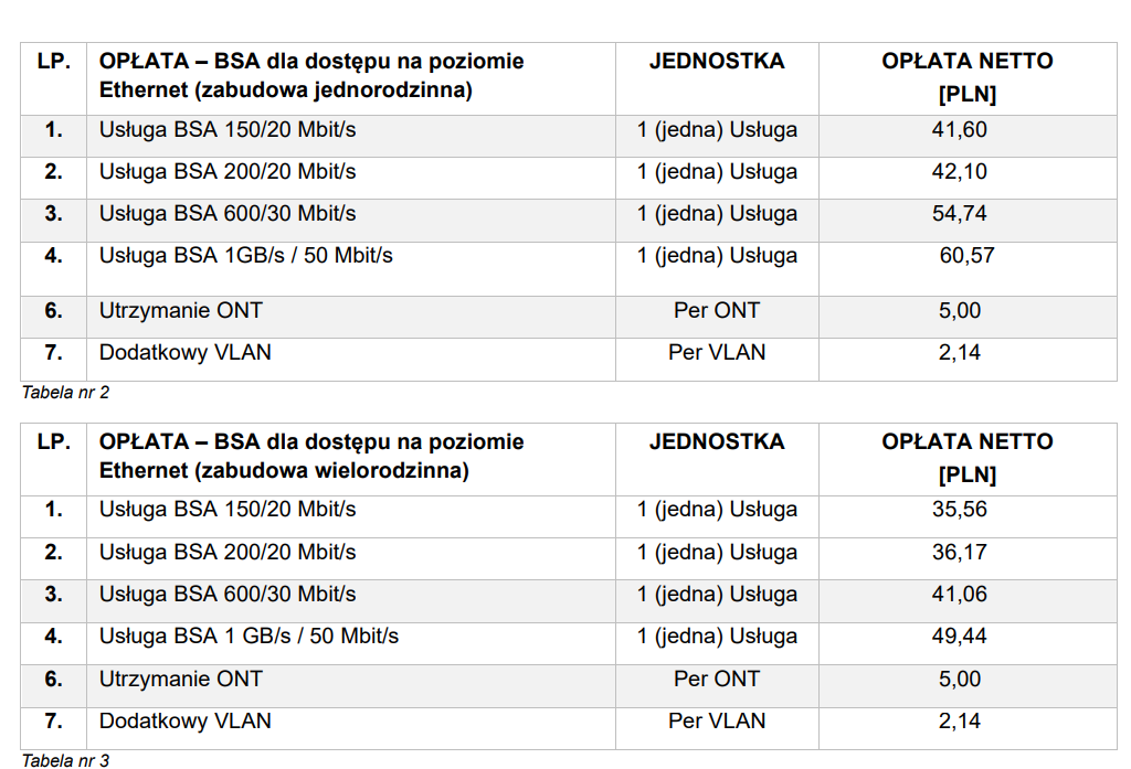 Dodatkowo uruchomienie usługi BSA kosztuje 206,65 zł, zmiana jej parametrów – 28,65 zł, a jej dezaktywacja – 59,90 zł.