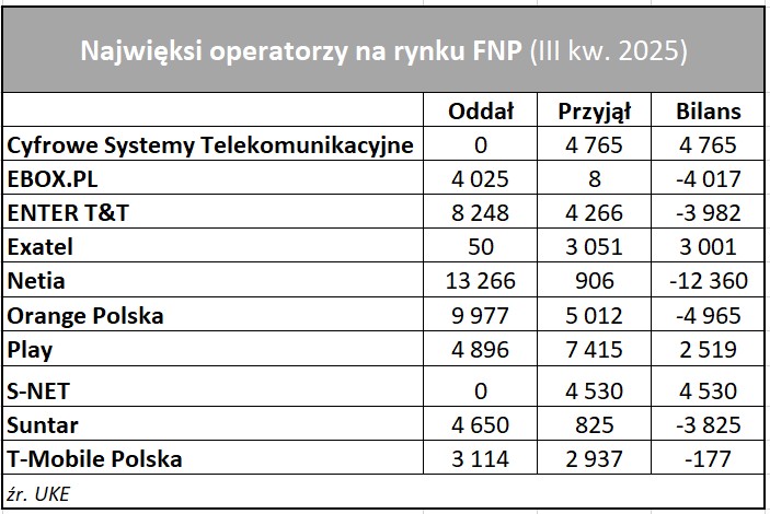Na rynku MNP najlepszy bilans zanotował w minionym kwartale Play, który netto pozyskał 26 tys. numerów. Orange zdobył netto 9 tys. numerów, T-Mobile stracił 11 tys. a Polkomtel stracił 51 tys. Takie trendy utrzymują się od początku roku. Play zyskiwał także w I i II kw. tego roku, T-Mobile oraz Polkomtel w tym czasie traciły. Orange tracił na początku roku, by wyjść na plus w dwóch kolejnych kwartałach. Od początku roku Play pozyskał 43 tys. numerów, a Polkomtel oddał ponad 100 tys.