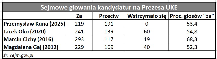 Jak informowaliśmy wczoraj, Sejm przyjął kandydaturę Przemysława Kuny na stanowisko Prezesa Urzędu Komunikacji Elektronicznej. W głosowaniu jego kandydatura przeszła 13 głosami, uzyskując ponad 53-proc. poparcie posłów. Nie odbiegało to istotnie od tego, co uzyskiwali poprzedni czterej kandydaci na Prezesa UKE w sejmowych głosowaniach (wcześniej szefa urzędu regulacyjnego desygnował osobiście premier).