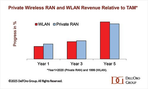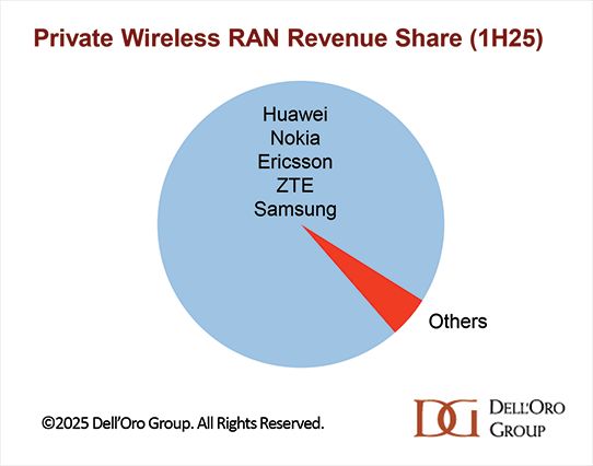 Choć wdrożenia prywatnych sieci 5G są wciąż na wczesnym etapie, ich udział w całkowitych przychodach rynku RAN w pierwszej połowie 2025 r. osiągnął już poziom „średnich jednocyfrowych wartości”, podczas gdy w 2022 r. był to udział „niskich jednocyfrowych wartości”. Rozwój segmentu przebiega w tempie porównywalnym do adopcji WiFi w przedsiębiorstwach w pierwszych pięciu latach jego rozwoju.
