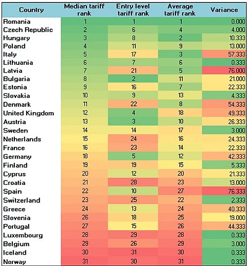 Pod koniec marca 2025 r. najtańsze taryfy za szerokopasmowy dostęp do internetu dla gospodarstw domowych oparte na miedzi były najtańsze (51 USD wg parytetu siły nabywczej PPP (Purchasing Power Parity).