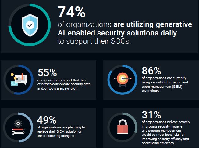 Generatywna sztuczna inteligencja staje się kluczowym elementem operacji bezpieczeństwa – 74 proc. respondentów deklaruje codzienne korzystanie z rozwiązań GenAI do automatyzacji zadań. Szybka adopcja sprawia, że GenAI może wkrótce prześcignąć systemy orkiestracji, automatyzacji i reagowania (SOAR - security orchestration, automation, and response). Ponadto technologia ta pomaga eliminować wyzwania związane z tworzeniem reguł wykrywania zagrożeń, korelowaniem danych z różnych źródeł oraz operacjonalizacją informacji o zagrożeniach.