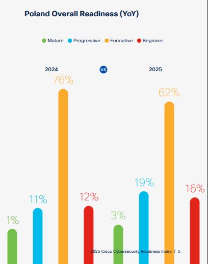 Polskie firmy wciąż nie są odpowiednio przygotowane na wyzwania związane z cyberbezpieczeństwem – wynika z raportu Cisco Cybersecurity Readiness Index 2025. Tylko 3 proc. organizacji nad Wisłą osiągnęło dojrzały poziom gotowości na zagrożenia cyfrowe, a globalnie sytuacja jest niewiele lepsza (4 proc.).