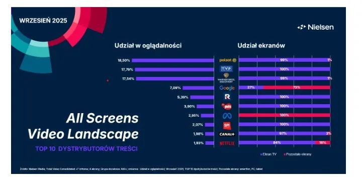 W zestawieniu największych grup nadawców liderem pozostała Grupa Polsat z udziałem 18,5 proc., przed TVP (17,79 proc.) i Warner Bros. Discovery (17,54 proc.). Na dalszych miejscach bez zmian – Canal+ utrzymał dziewiątą pozycję, a Netflix zamyka stawkę dziesięciu największych graczy.